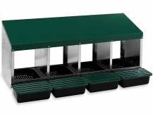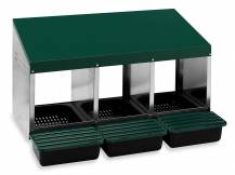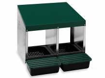 Znáškové hniezdo na sliepky so zberným košíkom na vajcia, na nožičkách, až pre 5 nosníc, na umiestnenie na zem, jednoduchá údržba. Ak riešite problém s požieraním či zanášaním vajec, potom pre Vás máme bezva tip. Znáškové hniezdo je vyrobené tak, aby sa vajcia samé ihneď po znesení odkotúľali do zásobníka, z ktorého si jednoducho čisté a nepoškodené vajcia odoberiete. Kukaň stačí jednoducho umiestniť na podlahu v kurníku. Hniezdo vyrobené z kvalitného plastu je veľmi odolné voči nečistotám, a tak jeho údržba a dezinfekcia zaberie len chvíľku. Rozmery: D 44cm (28cm bez košíka) x Š 37cm x V 63cm.